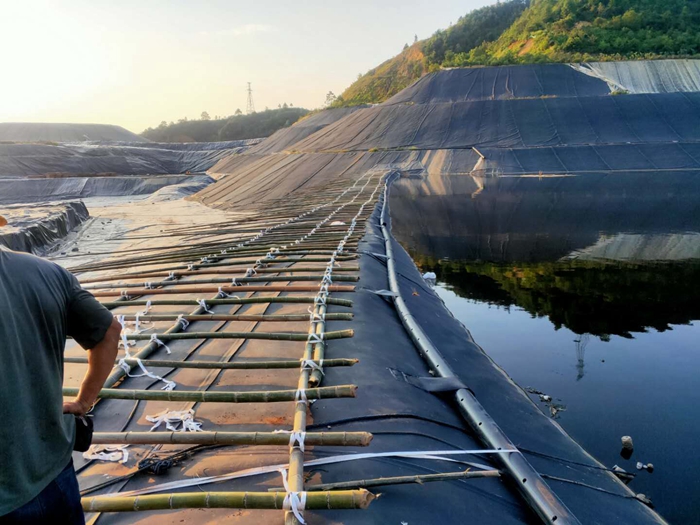 然后是铺设高密度聚乙烯土工膜。欧洲早在上世纪80年代开始用高密度聚乙烯土工膜,也叫HDPE(高密度聚乙烯)防渗土工膜,又叫防渗膜,用于垃圾填埋场的防渗工程中。随着我国对生态环境的重视,以及国民意识日益提高,防渗膜在垃圾填埋场处理得到广泛的应用。将HDPE(高密度聚乙烯)防渗膜铺设在膨润土防水毯上,拉伸平整,不得有大的气泡,压平整,避免挖掘机等重型机械在铺设的防渗
