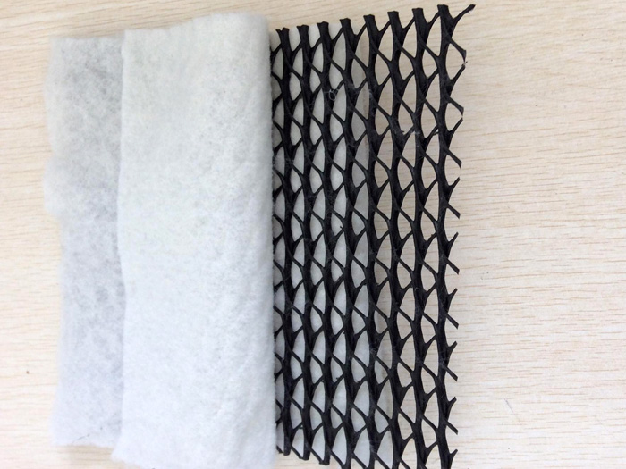 复合排水网由三维土工网双面粘结土工布制成组合了土工布(反滤作用)和土工网(排水和保护作用),提供“反滤-排水-保护”功效。 复合排水网网芯的三维结构,在整个使用过程中能够承受较高的压缩荷载,并能保持相当的厚度,提供很好的导水率。
